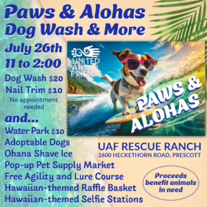 Come join us at the UAF Rescue Ranch for our Paws & Alohas fundraising event, featuring a dog wash and activities for your pet, along with a pop-up pet supply market and cool treats for you. Sammi Maon, our resident trainer, will be offering free agility training and lure coursing, in which your dog gets to chase an artificial lure along a course that simulates live prey. After all that activity, treat your pooch to an all-day water park pass for a refreshing cool-down. While you’re there, pick up some bargains at our pop-up market and treat yourself to a delicious treat from the Ohana Shave Ice food truck. See you there! Aloha!
