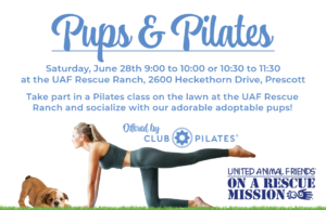 Club Pilates of Prescott is hosting Pups & Pilates on the Rescue Ranch lawn, where you can get some great exercise while socializing with some great adoptable pups. Classes will be held at 9:00am and 10:30am for donation to United Animal Friends.